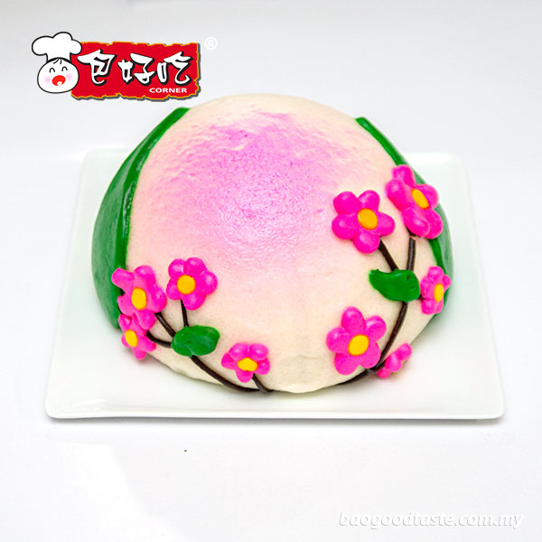 精心捏制的一颗大寿包,象征福寿绵长、安康喜庆;再以两片绿叶与两支桃花点缀其旁,寓意春意常在、寿运满盈。